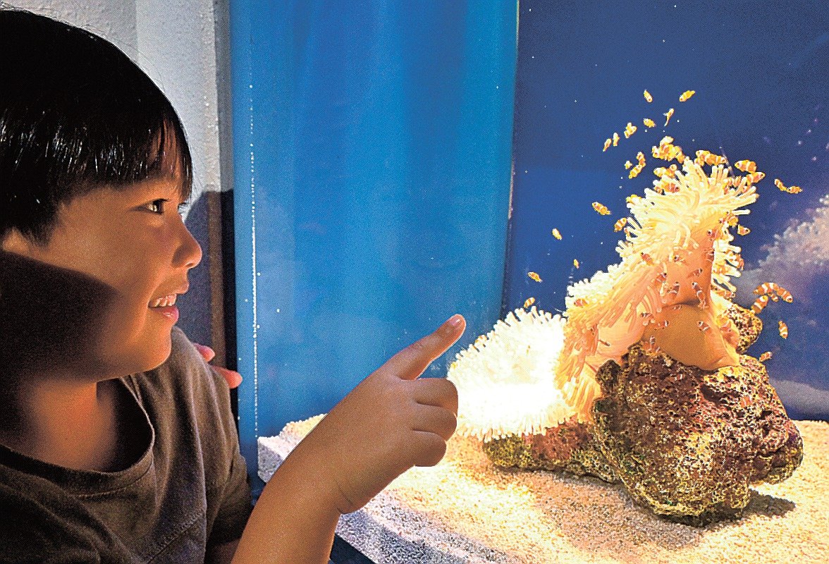 カクレクマノミは7月に館内で生まれ、約2週間でオレンジ色の体色になった。イソギンチャクの毒で外敵から守ってもらい、餌をイソギンチャクに供給する。成長して大きくなると縄張り意識から、互いを攻撃するという。