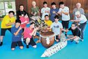 焼き魚皿や花器、とっくりなど約200枚の陶器で表現し、高さ2メートルの「しまねっこ」を仕上げた。伊藤桧日斗さん(13)は「みんなで話し合いながら作るのが楽しくて、普段関わりのない同級生とも仲良くなった」と話し、達成感をにじませた。