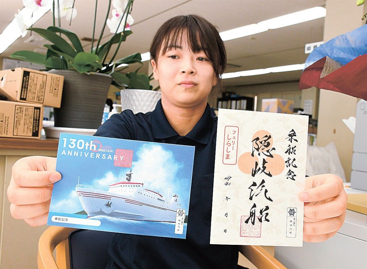 同社は西ノ島で神職だった松浦斌(さかる)氏の私財などで開設された隠岐航路を受け継ぎ、島民資本で1895年10月1日に発足した。130年の節目に旅行者らに好評を得ている御船印の特別バージョンを企画。絵柄は西郷から境港に向かうフェリーしらしまが波を切るデザインとした。
