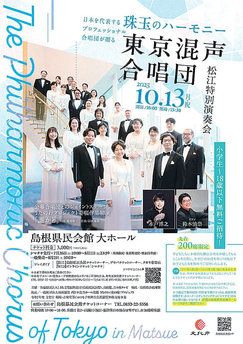 数少ないプロ合唱団の中でも最高峰とされる「東京混声合唱団」の松江特別演奏会が13日午後4時、松江市殿町の県民会館大ホールである。松江での公演は初めて。