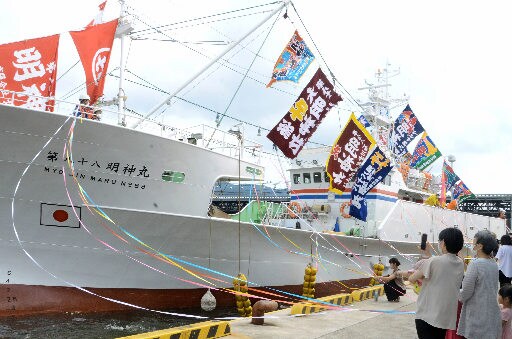 出漁式では、水産関係者でつくる境港カニ水揚げ日本一PR実行委員会の越河彰統会長(59)が「境港はカニの水揚げ日本一。コロナの影響は多大だが、一刻も早い収束と無事故、豊漁を祈る」とあいさつ。伊達憲太郎市長は「初夏のクロマグロに続きベニズワイガニの季節がやってきた。全国の 消費者に届けるため関係者が一丸となり頑張る」と話した。