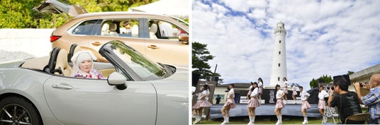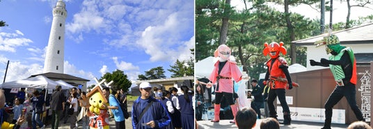 イベントでは、地元グルメが楽しめる飲食ブースに加え、協賛社の島根マツダブースに車両展示、ステージでは地元高校生(大社高校ダンス部、立正大淞南高校マーチング部)がマーチングやダンスを披露。また、豪華景品があたる抽選会、地元戦隊ヒーローショー(カミアリージャー)などが会場を盛り上げました。立正大淞南高校マーチング部は灯台周辺エリアでパレードも実施し、コスプレイヤーや島根のゆるキャラしまねっこ、えいっとくん(山陰中央テレビキャラクター)、秘密結社鷹の爪吉田くん(海と日本プロジェクトinしまね メインキャラクター)も一緒に盛り上げました。また飲食ブースの中には地元の出雲商業高校が手がける”出商デパート”も出展し、高校生と地元食品メーカーがコラボしたお菓子も販売されたり、地元住民が開発した”ミサキバーガー”や”灯台クッキー”など灯台エリアにちなんだグルメもお目見えしました。