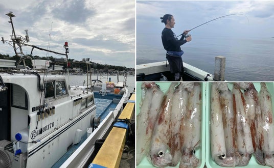 左:遊漁船「シージャンキー」 、右上:「シージャンキー」代表 小林氏、右下:釣り上げたケンサキイカ