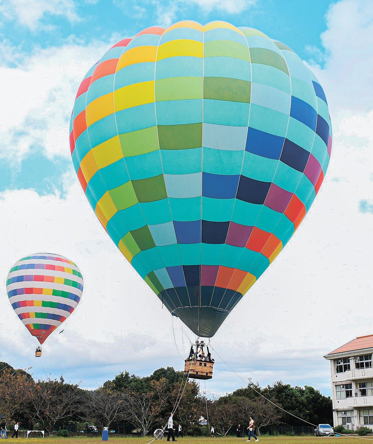 同町釛、聖郷小学校と聖郷運動広場で、2機の気球がロープにつないで上げられた。それぞれ7、8人が代わる代わる乗り込み、バーナーの炎で温まった空気を浮力にして音もなく上がる気球の浮遊感を味わった。地上の家族らに手を振りながら遠くの景色も楽しんだ。