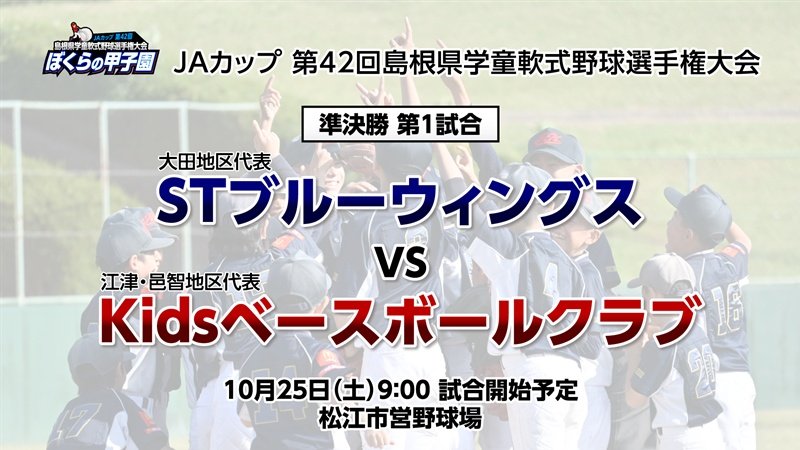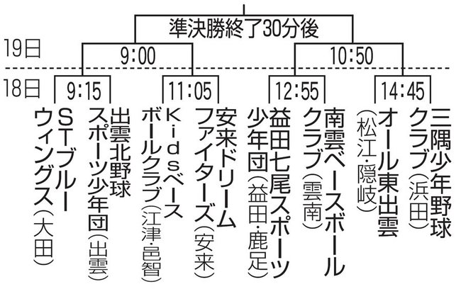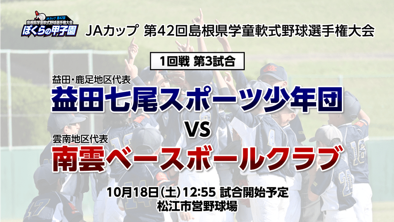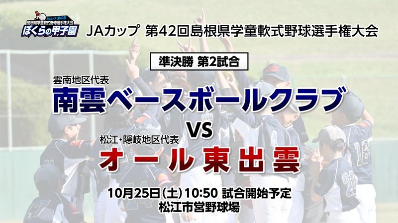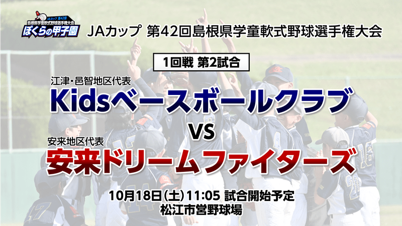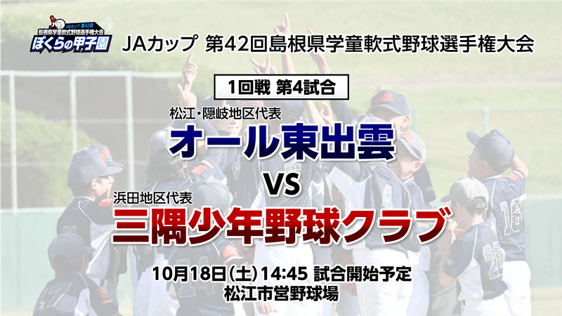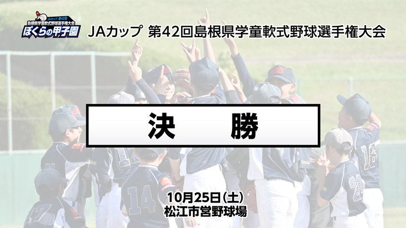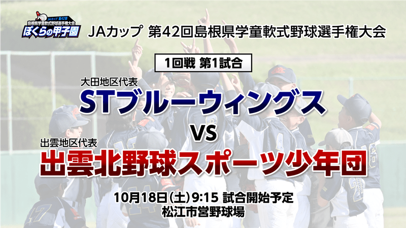JAカップ第42回島根県学童軟式野球選手権大会(山陰中央新報社、県軟式野球連盟主催、JAしまね、JA共済連島根特別協賛)の1回戦4試合が18、19の両日、松江市営野球場(松江市上乃木10丁目)である。準決勝、決勝は25日に行われる。