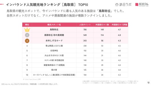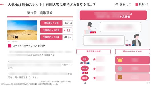 業界最大級のインバウンドビジネスメディア「訪日ラボ」及び 店舗向け集客一元化プラットフォーム「口コミコム」を運営する株式会社mov(代表取締役:渡邊 誠、本社:東京都渋谷区、以下mov)は、鳥取県の観光地に寄せられた最新の口コミデータから、独自の『インバウンド人気観光地ランキング』を発表しました。