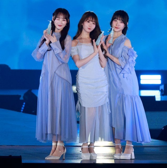 3人はファンケル「“すっぴん変わる!”スペシャルステージ」に参加。透け感のある肌見せスタイルのブルーワンピースでそろえつつも、それぞれが三者三様のコーディネートを披露した。女神のような透明感あふれる雰囲気とそろった色味で、ステージに華やかさを添えた。