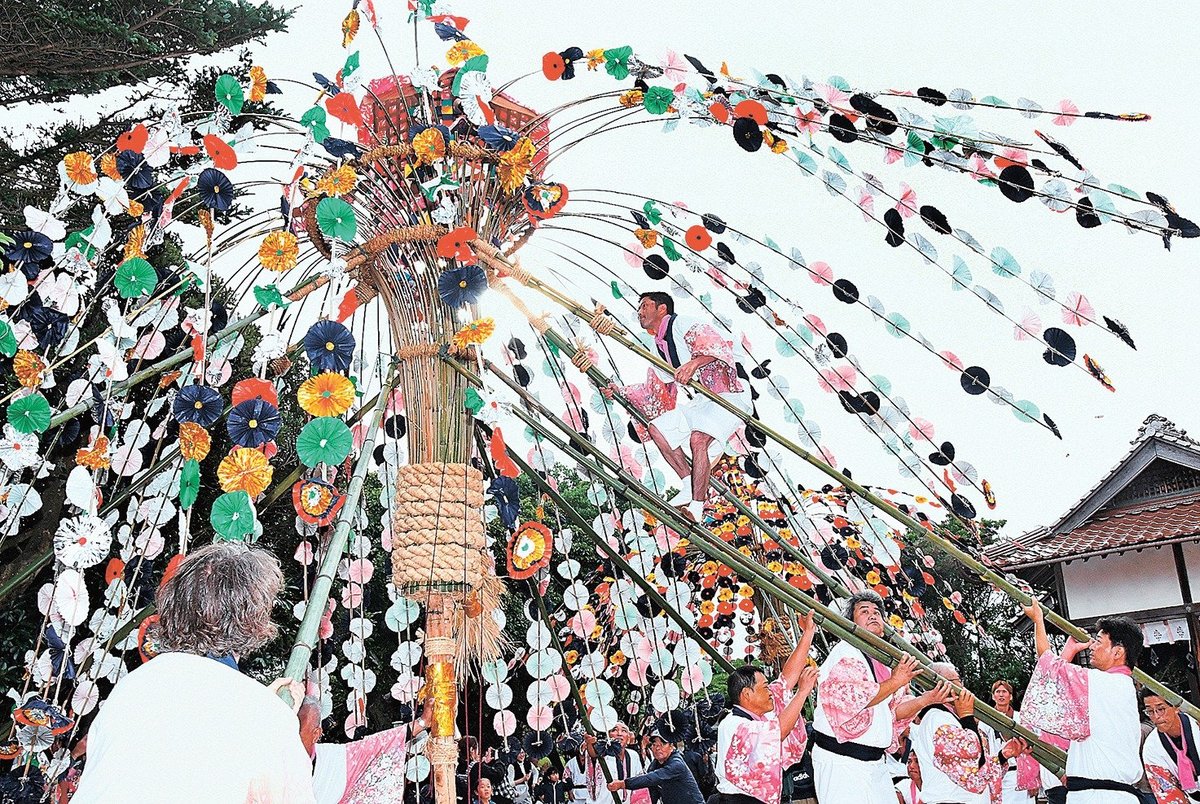 最終日の19日は、神社の境内に、住民有志が作った3本を含めた計4本の神事華が立てられ、男衆が祝い歌を歌いながら、華の周りで踊りを披露。終盤には、男衆の一人が竹を伝っててっぺんに上り、上から餅や菓子をまき、住民らが競うように取り合った。