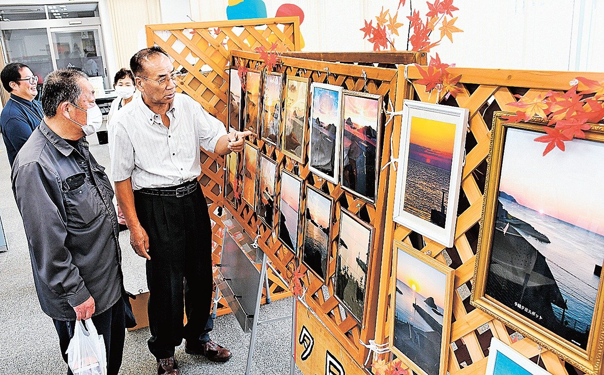 若松さんが5年前に自宅近くの裏山を整備した夕日スポットの紹介や、撮影した季節ごとの夕日の写真26点が並ぶ。若松さんは春の淡い空や、秋のいわし雲と夕日の共演がお薦めといい「同じ写真は二度と撮れない。町内でも知らない人が多いので、足を運んでほしい」と呼びかけた。