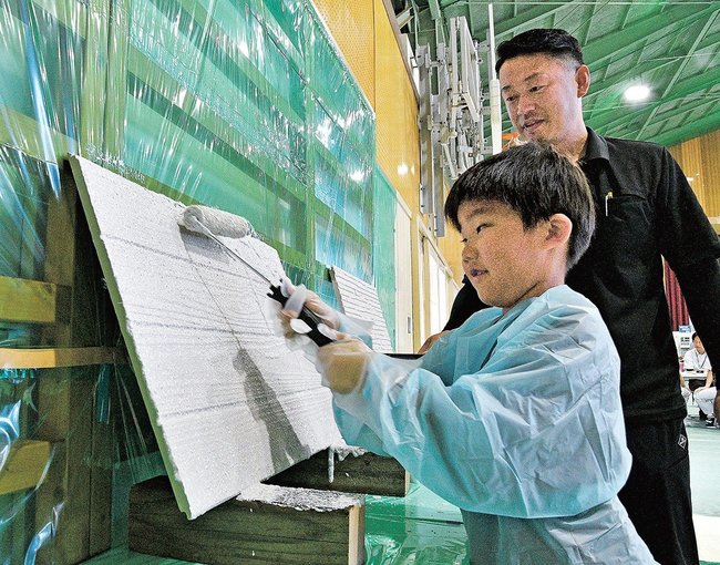 江津工高での日本塗装工業会島根県支部ブースでは、子どもが支部会員の手ほどきで、専用ローラーを使って外壁用ボード(縦45センチ、横70センチ)に塗料2種類を塗った。島根電工のブースでは電気配線のスイッチと照明の配線をつなげて点灯させる工程を学んだ。江津工高の生徒による木工やアクリルスタンド製作もあった。