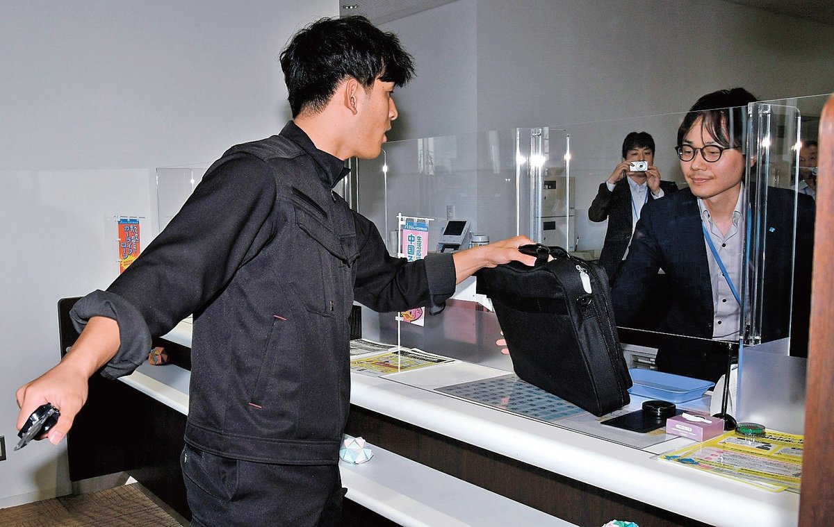 【安来】金融機関窓口での強盗対応訓練がこのほど、安来市南十神町の中国労働金庫安来支店であり、職員8人が現金を要求する犯人役の安来署員に対応し万一の事態に備えた。