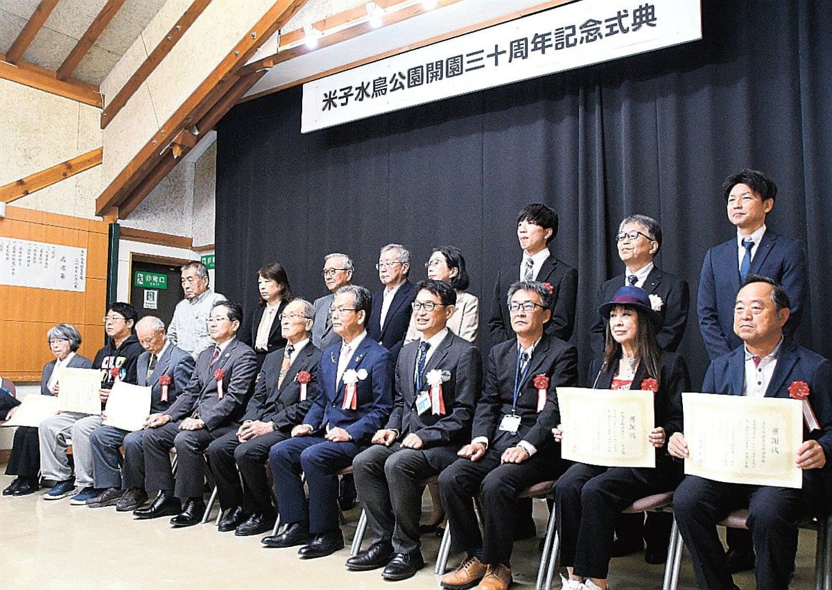 【米子】米子市彦名新田の米子水鳥公園が開園30周年を迎え、22日、記念式典があった。長年園内の環境保全に尽力してきた功労6団体が表彰を受け、数多くの野生の鳥類が羽休めに飛来する環境を保全し、発展させる決意を新たにした。