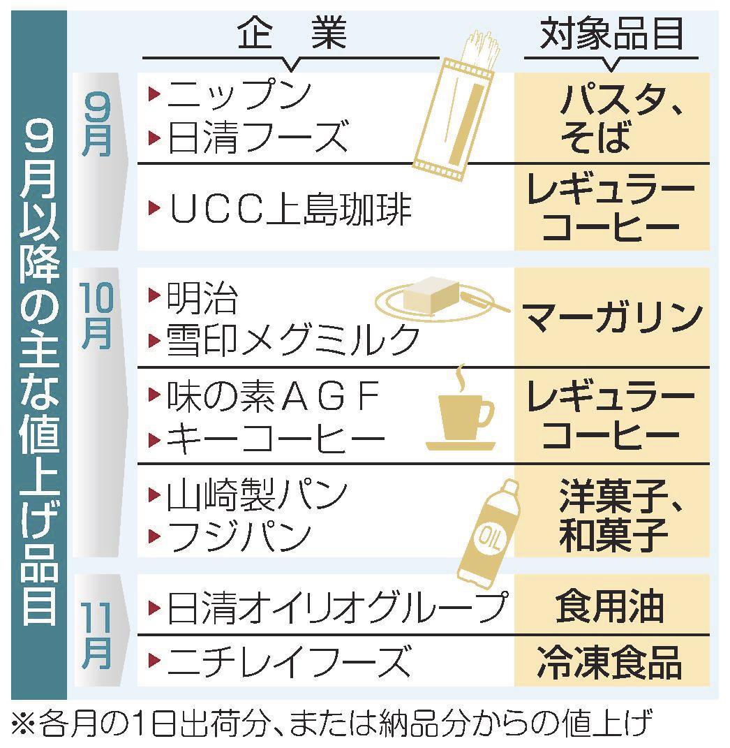 コーンや菜種、パーム油の相場上昇も影響する。明治のマーガリンは約13年ぶりの価格引き上げで「明治コーンソフト」は約1割高くなる。山崎製パンとフジパンは洋菓子と和菓子を値上げ。11月は日清オイリオグループやJ―オイルミルズが食用油、ニチレイフーズが揚げ物など冷凍食品の価格を上げる。