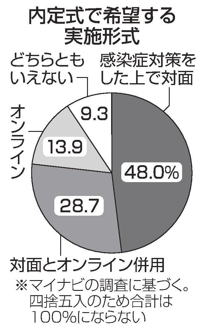 多くの企業が予定する10月1日の内定式を前に、インターネットで7月下旬に調査した。3631人のうち、十分な感染症対策をした上での対面の内定式の実施を希望したのは48・0%だった。対面とオンラインの併用を望むのは28・7%。オンラインだけで実施してほしいとの答えは13・9%だった。