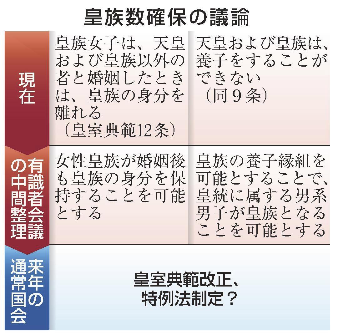 皇室典範は「皇族女子は、天皇および皇族以外の者と婚姻したときは、皇族の身分を離れる」「天皇および皇族は、養子をすることができない」と定めており、中間整理を実現するには皇室典範改正か特例法制定が必要になる。