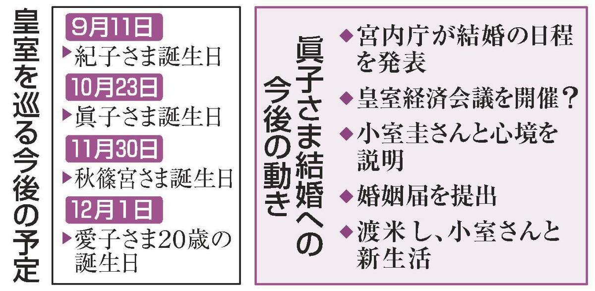 眞子さまは20年11月に公表した文書で、結婚は「生きていくために必要な選択」と強い思いを明かした。秋篠宮さまは同月の誕生日記者会見で結婚を「認める」としつつ、国民の多くが納得する状況ではないとの認識を示していた。