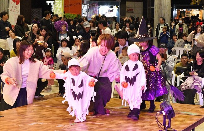 江津市江津町のパレットごうつで25日、恒例のハロウィーンイベントがあり、来場者800人が仮装コンテストや音楽ステージを楽しんだ。