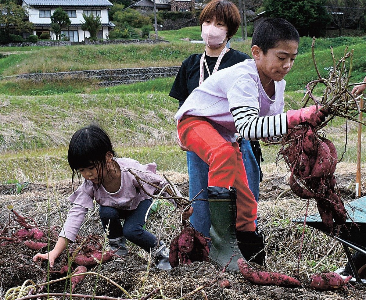 出雲市佐田町の畑で25日、住民団体の佐田地域づくり協議会が育てたサツマイモの収穫体験会を開いた。松江、出雲両市などから約20人が参加し、秋の豊かな実りを体感した。