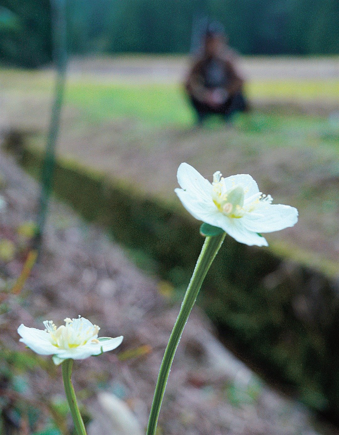 山林はラン科の希少植物キンランの自生地でも知られる。野口さんはキンランとともにウメバチソウも守ってきた。野口さんは「白くてかわいらしい花を見てほしい」と話した。