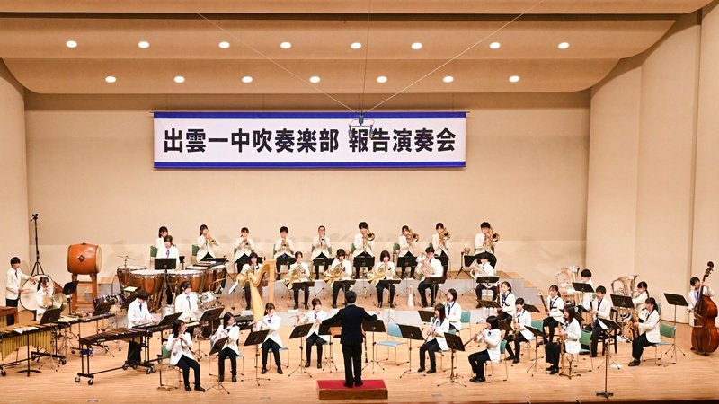 全日本吹奏楽コンクール全国大会(中学生の部)に出場した出雲一中吹奏楽部が26日、出雲市塩冶有原町2丁目の出雲市民会館で報告演奏会を開いた。3年生16人には「卒業」を意味する舞台で、情熱的に音を響かせながら伝統ある部で過ごした日々を振り返った。