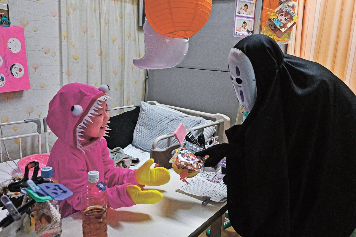 カボチャやコウモリなどで飾り付けた病室を、魔女などの仮装をした医師や看護師が訪れ「ハッピーハロウィーン」と声をかけながら子どもたち32人にお菓子を手渡した。境港観光協会は「ゲゲゲの鬼太郎」の鬼太郎や一反木綿などに扮(ふん)し、ソフトクリームをプレゼントした。