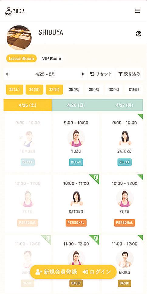 スポーツジムの入退会やレッスンの予約がオンラインでできるhacomono(ハコモノ、東京)のサービス。スマホで手続きができ、実際の来店はレッスン当日だけだ。オンラインでの指導を選べば、自宅で気軽にヨガなどに打ち込める。