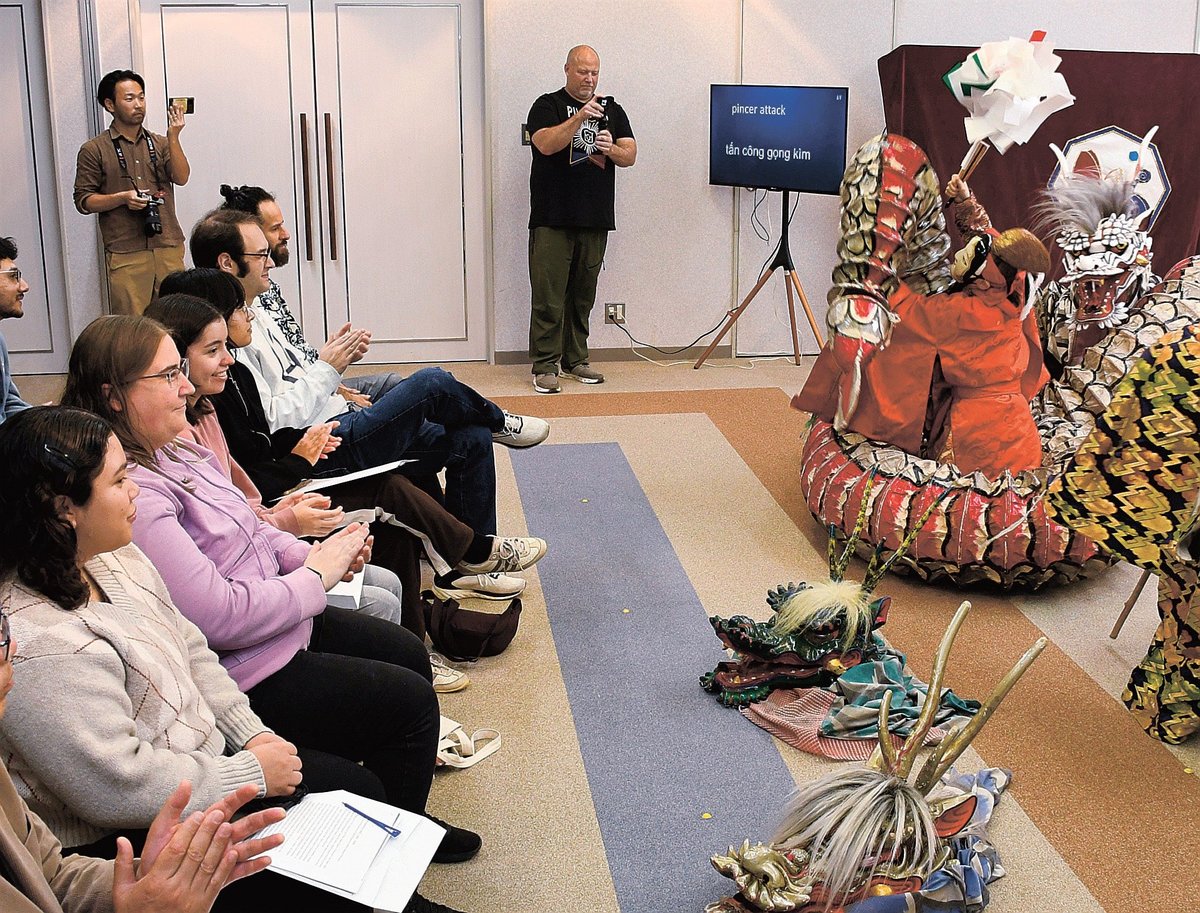 江口教授が石見神楽の歴史を紹介した後、女子神楽同好会「舞姫社中」が石見神楽の代表演目「大蛇(おろち)」を披露した。参加者は、間近で繰り広げられる立ち合いをスマートフォンで撮ったり、手をたたいたりして鑑賞した。蛇胴を身に着ける体験会もあり、舞姫社中のメンバーに教わりながら技を練習した。