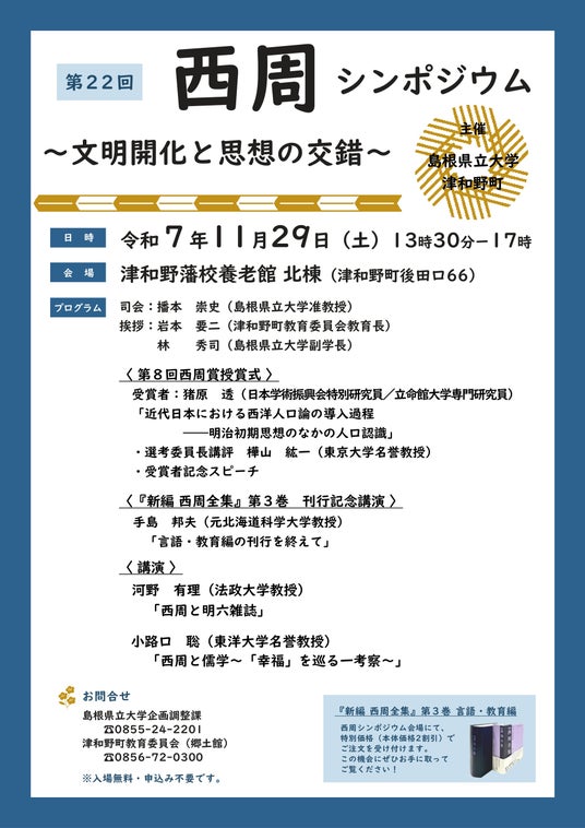 令和7年11月29日(土)、「文明開化と思想の交錯」をテーマに第22回 西周シンポジウムを開催します。入場無料・申し込み不要です。