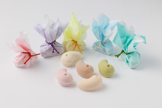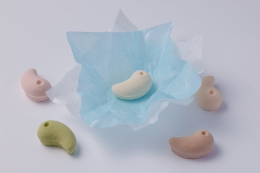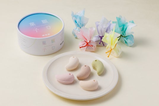丸みを帯びた出雲勾玉の形をした、いちご・ココア・柚子・和三盆・抹茶の味わいの干菓子。