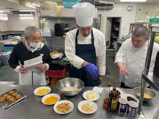 「サンラポーむらくも」総料理長・照沼英則氏(右)との打合せの様子