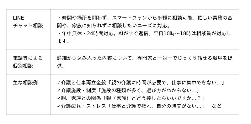 働きながら家族の介護を行う従業員(ビジネスケアラー)の不安解消と、介護離職の防止に向けた体制整備の一環として、AIと看護師・ケアマネージャーなどの専門職が個別で対応する窓口を提供します。これにより、従業員一人ひとりが安心して長く活躍できる職場環境整備をサポートし、企業と働く人双方の持続的な成長に貢献してまいります。