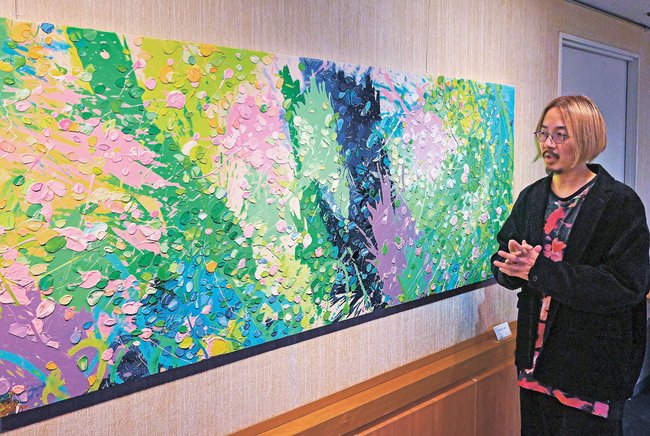 個展では、花を題材にした油彩画の新作35点を展示。「Petals of Light」(縦80・5センチ、横233・4センチ)は、花という小さな存在の命の輝きや営みを描いた。気候などコントロールできない環境への適応を表現しようと、絵の具を重ねたり投げ付けたりして偶然性を取り入れた。