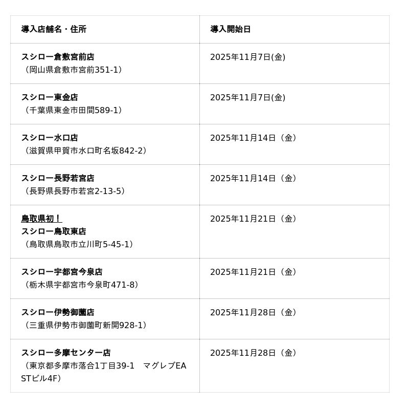 株式会社あきんどスシロー(本社:大阪府吹田市、代表取締役社長:新居 耕平)は、多くのお客さまからのご好評を受け、「デジタル スシロービジョン」、通称「デジロー」の導入を加速しております。県内初として、鳥取県「鳥取東店」に導入し、その他のエリアでも導入店舗を拡大いたします。