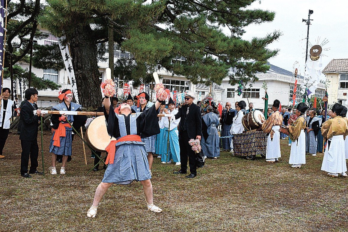 【隠岐の島】島根県隠岐の島町の地域住民総出の祭りで県指定無形民俗文化財「隠岐武良祭風流(むらまつりふりゅう)」がこのほど、同町中村で営まれた。二つの神社から出たみこしが会所に集まり、いにしえから受け継がれた独特の神事の所作や舞が披露された。