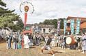 会所で合流した行列は広場中心にある唐傘の松の周囲を歩き、頬に赤い丸の化粧を施したはやし方の「陰陽胴」が天を仰ぐような独特の所作で太鼓を打ち鳴らした。神事では子どもたちによる「浦安舞」や「神相撲(こずま)」が奉納され、近くの町道では神馬が駆け巡る騎馬や流鏑馬(やぶさめ)が勇壮に行われた。