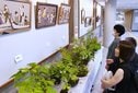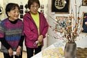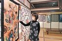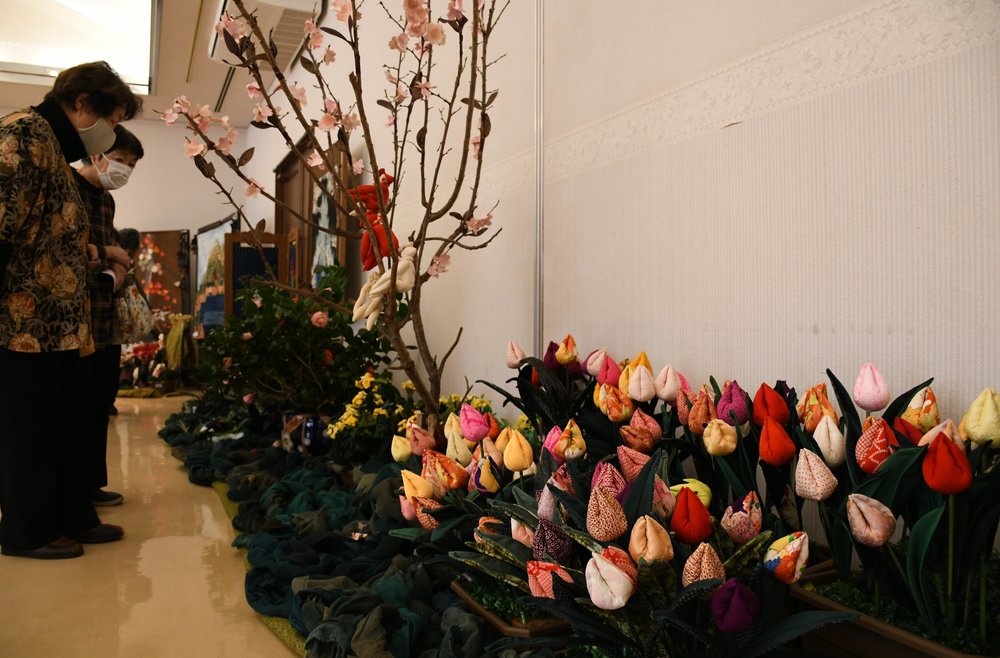 会場にはそれぞれが2年間で制作したタペストリーを中心に展示。柳沢さんは、赤や青、紫で表現した花畑をチョウが乱舞する「幸せの花園」や、千枚のうろこを縫い合わせた「龍神」など2メートルを超す大作5点を並べる。生徒もアサガオやフジ、花火、三瓶山の紅葉など四季折々の花々や風景を、多彩な古布の色や柄を生かして描写している。