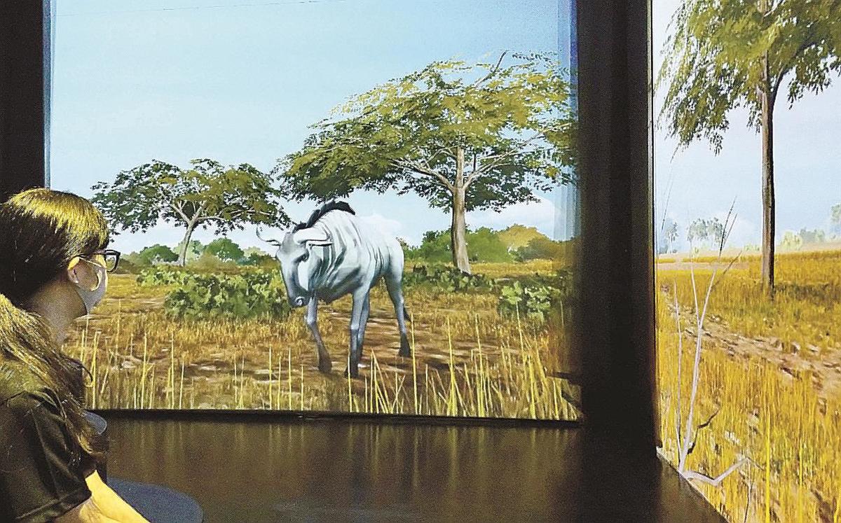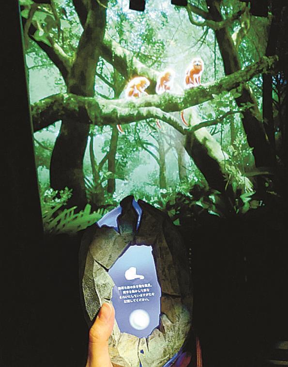 緑深い森で戯れる金色の毛のサル、夕暮れの草原を移動するヌーの群れ―。同施設の特長は、鮮やかなアニメーションで映し出す生き物や自然だ。水辺や森など五つのゾーンがあり、大小の画面に次々現れる生き物が時間や天候の経過に合わせ、普段の姿や警戒しているときの行動を見せる。