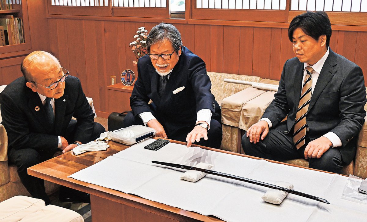 町役場での受贈式で、偲訓さんは「寄贈した刀剣は約400年前のもの。時代背景も一緒に感じてもらいたい」と話した。刀を手に持った中村町長は「貴重な刀剣を寄贈していただいた。大切にしながら文化、教育振興に努めていきたい」と感謝した。