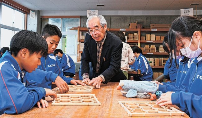 錦織陽向太(ひなた)さん(13)は「部材を組み合わせるところや、のりで張るところが難しかった。きれいな文様ができたので、家族に見せて、自宅の玄関に飾りたい」と喜んだ。