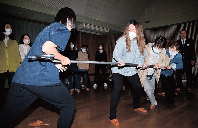 参加者は「刺股は定期的に訓練しておかないと使うのが難しい」「不審者を壁に追い詰めると効果がある」と署員からアドバイスを受け、柄の長さ約3メートルの刺股を手に、不審者と距離を取るための力の入れ方を学んだ。