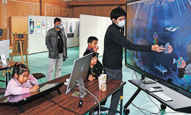 「お絵描き水族館」を楽しんだ横田幼児園年長の堀江あかねちゃん(6)は「(学生の)お兄ちゃんが丁寧に教えてくれてとても楽しかった。またやりたい」と笑顔だった。