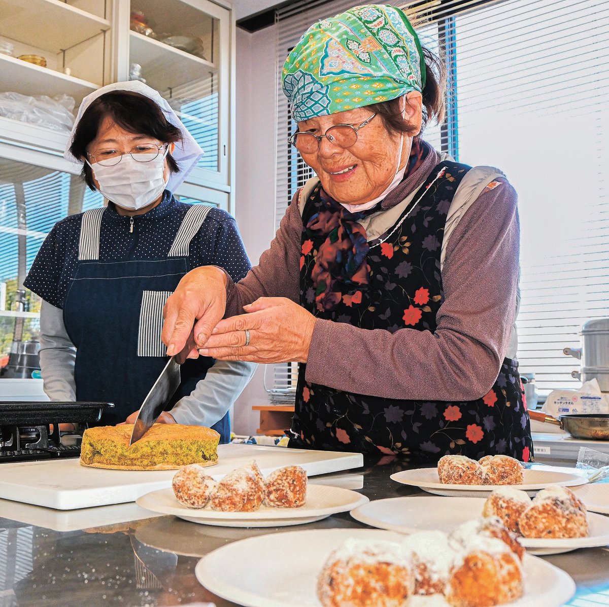 初めて開催し、抹茶カステラとサツマイモ揚げドーナツ作りに挑戦した。カステラでは卵白を泡立ててメレンゲを作り、米粉、抹茶と混ぜ合わせてオーブンで焼いた。ドーナツ作りは、サツマイモをゆでてつぶすところから始めた。