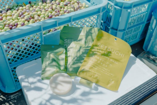 左: 香川県豊島産のオリーブオイル*を配合した「SETOUCHI OLIVE*」シリーズ(フェイスマスク、リップクリーム、洗顔石けんの3 種)です。全商品に保湿力に優れた香川県豊島産オリーブ果実油*と、広島県尾道市生口島産レモン果汁*を配合しています。