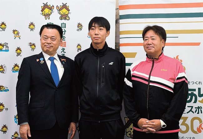 8月の全日本学生テニス選手権男子シングルスで優勝した島根県吉賀町出身の岩本晋之介さん(21)=関西大4年=がこのほど、島根県庁を訪問し、丸山達也知事に全国制覇を報告した。