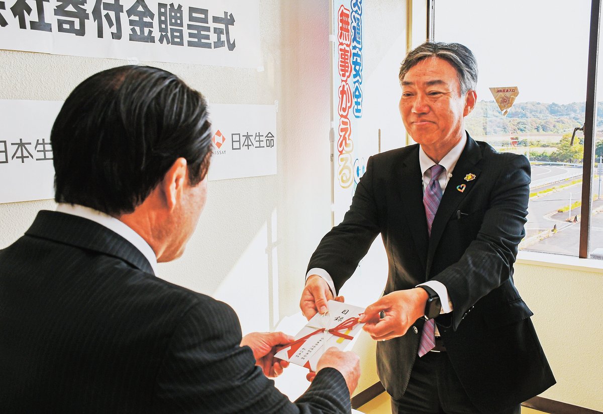 松江市打出町の同協会であった贈呈式で、同社本部の首藤丈司業務推進担当部長は、アンケートで県内では暮らしに関わる最も不安なリスクで「交通事故」とした割合が全国に比べて高かったとし、「交通安全への意識の高さがうかがえる」と紹介。同協会の坂根英明専務理事は「交通事故のない安全な県を目指す活動に活用したい」と感謝した。