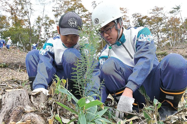 島根県邑南町の瑞穂小学校と瑞穂中学校の児童生徒が12日、町内の民有林でヒノキの植林に取り組んだ。豊かな自然が続くことを願い、丁寧に土をかぶせた。