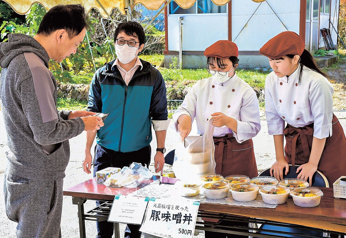 野菜の漬物や、同校が開発したみそを使った豚丼などの加工品が人気で、屋外では唐揚げや焼き芋、綿菓子の販売もあった。ビニールハウス内ではパンジーやビオラの花の苗が売られた。