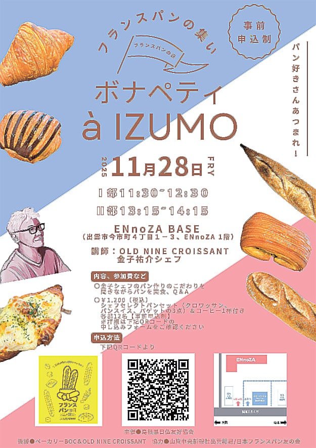 出雲市内のベーカリー店シェフこだわりのパン作りを伝える講演会「フランスパンの集い ボナペティ a IZUMO」が28日、出雲市今市町北本町4丁目にあるENnoZA(エンノザ)である。