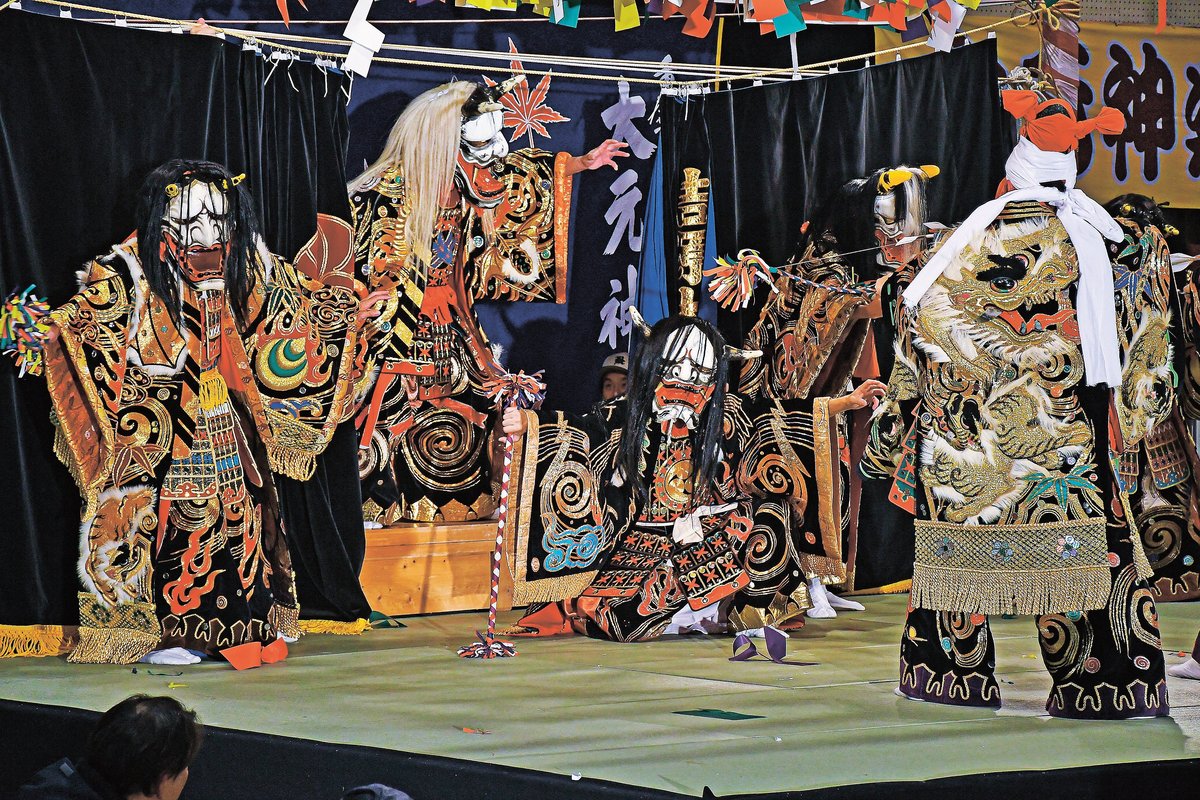 地元6団体と、浜田市旭町の1団体が計8演目を披露。神武天皇の威徳をたたえる「神武(じんむ)」や、舞台上で遊び舞う鬼を神が退治する「鍾馗(しょうき)」など、迫力ある立ち合いを演じた。