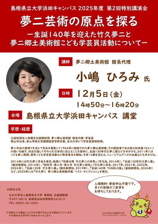 島根県立大学浜田キャンパスは、令和7年12月5日(金)に夢二郷土美術館館長代理 小嶋ひろみ氏による講演会を開催します。一般の方もご参加いただけます(事前申込不要)。多くの皆様のご来場をお待ちしております。